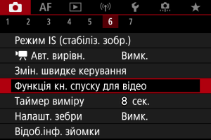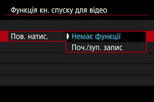 Якщо для параметра [Пов. натис.] встановлено значення [Поч./зуп. запис], ви можете почати або зупинити записування відео не лише натисканням кнопки відеозйомки, а й шляхом натискання кнопки затвора повністю або за допомогою дистанційного перемикача RS-60E3 (продається окремо).