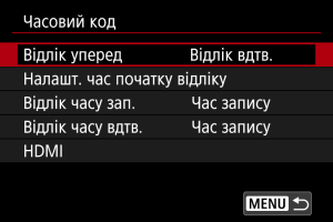 - Часові коди не додаватимуться до відео, що передається через HDMI, у разі зйомки відео з високою частотою кадрів, якщо для параметра [Відлік уперед] на вкладці [Часовий код] установлено значення [Відл. завжди].