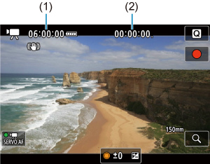Під час очікування в режимі записування відображає можливу тривалість записування. Під час записування відображає час, що минув після початку відеозйомки (1).