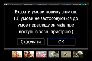 • Умови пошуку можуть бути стерті після операцій, пов’язаних із живленням камери або заміною карт пам’яті, а також із редагуванням, додаванням або видаленням зображень.