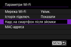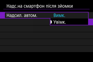 Знімки можна надсилати на смартфон автоматично. Перед виконанням наведених нижче кроків переконайтеся, що камера та смартфон з’єднані через Wi-Fi.