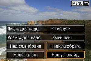 Надсилайте одночасно всі зображення, які відповідають умовам пошуку, заданим у меню [Встан. умови пошуку знімків]. Докладніше про [Встан. умови пошуку знімків] див. в розділі Встановлення умов пошуку зображень.