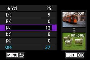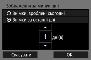 - Якщо вибрано пункт [Знімки за останні дні], для перегляду будуть доступні зображення, зняті протягом визначеної кількості днів до теперішньої дати. Поверніть диск