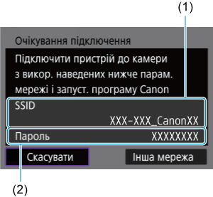 - Перевірте SSID (1) і Пароль (2), що відображаються на екрані камери.