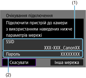 - Перевірте SSID (1) і Пароль (2), що відображаються на екрані камери.