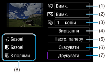 - (8) На екрані відображаються вибрані налаштування формату й типу паперу та компонування сторінки.