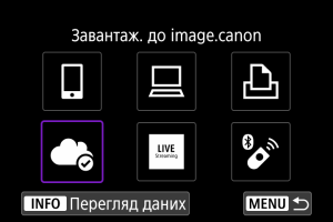 Зображення автоматично завантажуються в image.canon після запуску камери (або відновлення після автоматичного вимкнення). Оригінальні файли зображень, надіслані до служби image.canon, зберігаються там упродовж 30 днів без обмежень на простір для зберігання. Ці файли можна завантажити на комп’ютер або передати їх до інших веб-служб.