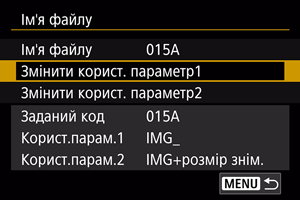 Параметр користувача 1 дає змогу зареєструвати чотири символи на ваш вибір. Параметр користувача 2 додає три початкові зареєстровані символи на ваш вибір до четвертого символу, що означає розмір зображення, який автоматично додається після зйомки.