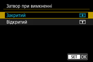 Можна налаштувати камеру так, щоб затвор залишався відкритим або закривався, коли перемикач живлення камери встановлено в положення .