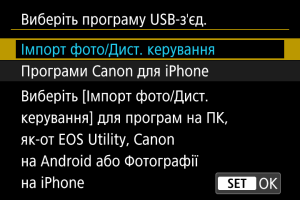Виберіть, чи будете ви використовувати службову програму EOS Utility після підключення до комп’ютера, чи будете використовувати спеціальні програми Android або версію Photos для iOS.