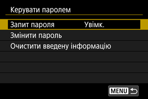 Використовуйте ці параметри, щоб керувати паролем, який потрібно вводити, коли перемикач живлення встановлюють у положення або камера відновлює роботу після автовимкнення. Вказівки щодо налаштування пароля, необхідного для запуску камери, див. в розділі Налаштування пароля.