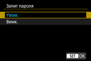Ви можете вибрати, чи потрібно вводити пароль після того, як перемикач живлення встановили в положення або камера відновила роботу після автовимкнення.