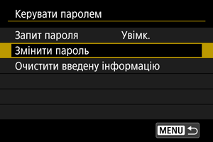 Ви можете змінити пароль, який потрібно вводити, коли перемикач живлення встановлюють у положення або камера відновлює роботу після автовимкнення.