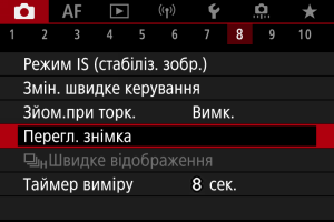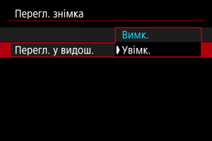 Щоб зображення відображалося негайно після зйомки, установіть значення [Доки утрим.]. Якщо не потрібно відображати знімок, установіть значення [Вимк.].