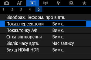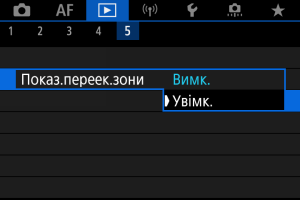 Можна вказати, щоб ділянки з надмірною експозицією блимали на екрані відтворення. Щоб отримати кращу градацію в зонах блимання, де потрібне точне передавання градації, установіть негативну величину корекції експозиції та повторіть зйомку.