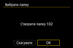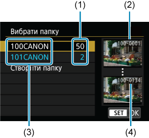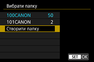 - Ім’я папки починається з трьох цифр (номер папки), за якими йдуть п’ять символів (букв або цифр), наприклад «100CANON». Папка може містити до 9999 зображень (номери файлів від 0001 до 9999). Коли папка заповнюється, автоматично створюється нова з порядковим номером, більшим на один. Крім того, у разі виконання скидання вручну () нова папка створюється автоматично. Можна створювати папки з номерами від 100 до 999.