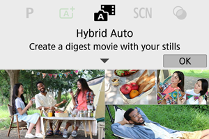With Hybrid Auto mode, you can make a short movie of the day just by shooting still photos. The camera records 2–4-second clips of scenes before each shot, which are later combined in a digest movie (, ).