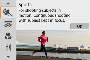 Use [] (Sports) mode to shoot subjects in motion, such as runners or moving vehicles.