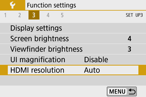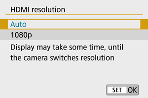 Set the image output resolution used when the camera is connected to a television or external recording device with an HDMI cable.