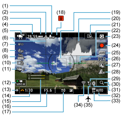 - The electronic level, grid lines, and histogram cannot be displayed during movie recording (and if they are currently displayed, recording a movie will clear the display).