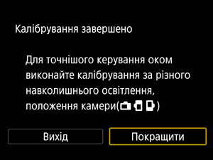 Процес реєстрації характеристик вашої лінії видимості для точного виявлення руху очей камерою під час зйомки через видошукач називається калібруванням. Калібрування забезпечує більшу точність керування очима.