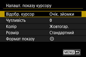 Для параметра відображення вказівника доступні такі значення: [Увімк.], [Очік. зйомки] або [Вимк.].