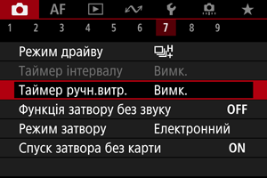 - Під час переключання режимів зйомки дані таймера ручної витримки скидаються, а сам таймер переходить у положення [Вимк.].