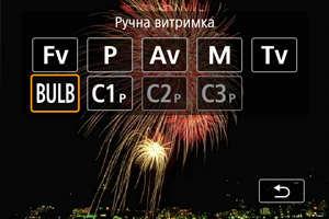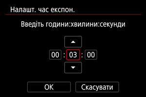 Тривалість експонування для зйомки з ручною витримкою можна встановити заздалегідь. За використання цієї функції не потрібно утримувати кнопку затвора протягом зйомки з ручною витримкою, що допомагає зменшити тремтіння камери.