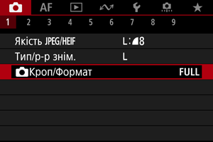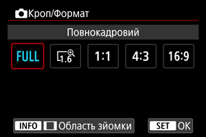 - Виберіть [Повнокадровий], [1,6x (кроп-фактор)], [1:1 (формат)], [4:3 (формат)] або [16:9 (формат)].