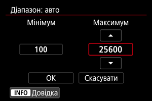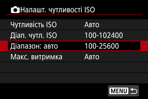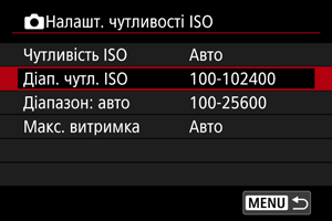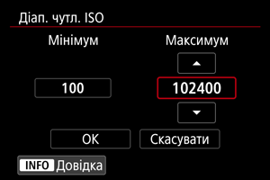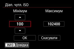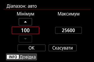 Можна встановити діапазон ручного настроювання чутливості ISO (мінімальне й максимальне значення). Мінімальне значення можна встановити в межах від «L» (еквівалент ISO 50) до ISO 102400, а максимальне — від ISO 100 до «H» (еквівалент ISO 204800).