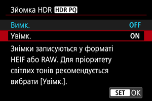- Перш ніж відтворювати на пристрої відображення зображень HDR знімки, захоплені за встановленого для параметра [
