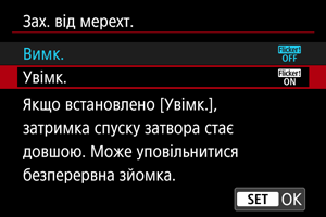 - Якщо встановлено значення [Увімк.] і джерело світла мерехтить, проміжок часу до спрацювання затвора може бути довшим.
