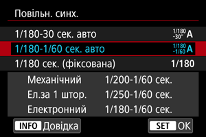 3. [1/250-1/60 сек. авто] (), коли встановлено значення [Ел.за 1 штор.], або [1/200-1/60 сек. авто] (