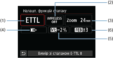 Інформація, що відображається на екрані, розташування дисплея та доступні параметри залежать від моделі зовнішнього спалаху Speedlite, налаштувань його користувацьких функцій, режиму спалаху й інших факторів. Докладніше про функції спалаху Speedlite див. в інструкції з використання спалаху Speedlite.
