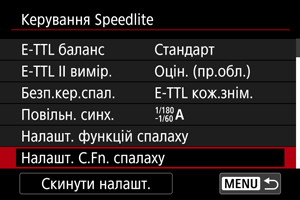 - Виберіть [Скинути налашт. спалаху] або [Стерти всі C.Fn Speedlite].