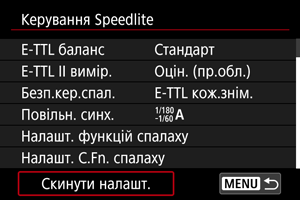 Скидання параметрів функцій спалаху/Скидання всіх користувацьких функцій Speedlite