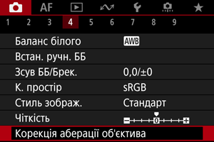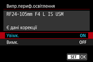 - Якщо використовується об'єктив іншого виробника (не Canon), для функцій корекції рекомендується встановлювати значення [Вимк.], навіть коли відображається повідомлення [Є дані корекції].