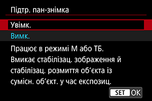 - Коли ввімкнено цю функцію, параметр [Зареєстр./викл. функції зйомки] () недоступний, навіть якщо натиснути кнопку, якій призначено функцію [Зареєстр./викл. функції зйомки].