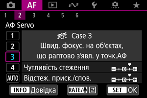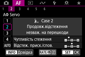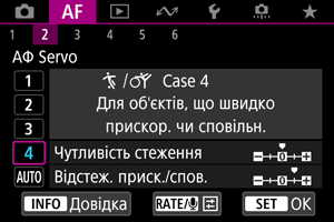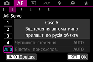 Проте краще натомість вибрати значення [Case 2]–[Case 4], якщо через точки АФ рухаються сторонні об'єкти, об'єкти зйомки важко впіймати або вони несподівано з’являються чи змінюють швидкість.