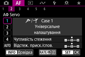 Параметри зйомки в режимі слідкуючого АФ можна легко налаштувати відповідно до ситуації чи об'єкта зйомки, просто вибравши потрібний випадок (параметр Case). Ця функція називається «Засіб налаштування АФ».