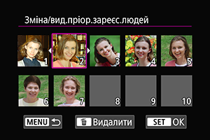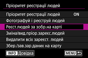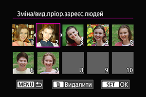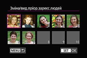Ви можете зареєструвати людей у камері, щоб виявляти їхні обличчя й надавати їм пріоритет щодо фокусування, яскравості та кольорового тону під час зйомки. Щоб зареєструвати чиєсь обличчя, можна сфотографувати цю людину або скористатися зображенням на карті пам'яті.