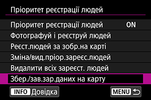 Зареєстровані дані облич можна зберегти на карту пам'яті. Завантаживши дані облич із карт інших камер EOS R3, також можна застосувати налаштування, що використовуються на цих камерах.