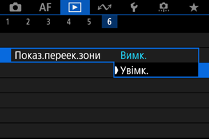 Можна вказати, щоб ділянки з надмірною експозицією блимали на екрані відтворення. Щоб отримати кращу градацію в зонах блимання, де потрібне точне передавання градації, установіть негативну величину корекції експозиції та повторіть зйомку.