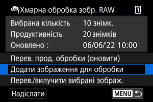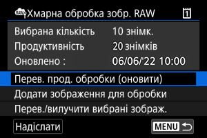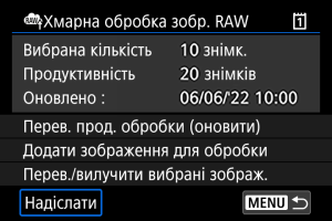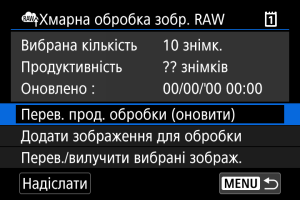 - [Продуктивність] дорівнює [0], якщо у вас немає платної підписки на хмарну обробку зображень RAW. Ви отримаєте інформацію про підписку на адресу електронної пошти, записану на image.canon, якщо ви перевіряєте можливість обробки без підписки.