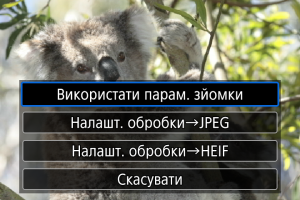 - Якщо використовуються функції [Налашт. обробки→JPEG] або [Налашт. обробки→HEIF], виберіть пункт [