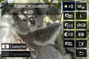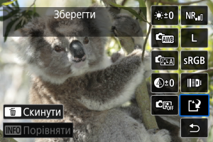 - Перемикатися між екранами [Після зміни] і [Параметри зйомки] можна за допомогою натискання кнопки