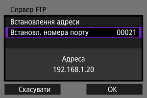 - За звичайних умов установіть для параметра [Встановл. номера порту] значення 00021 (для FTP/FTPS) або 00022 (для SFTP).