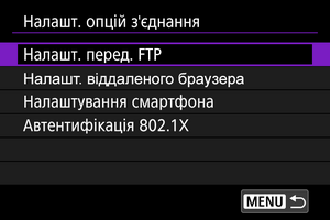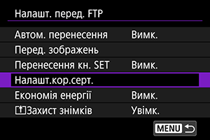 Якщо під час налаштування параметрів зв’язку ви вказали режим FTP [FTPS], потрібно імпортувати на камеру кореневий сертифікат, що використовується сервером FTP.