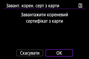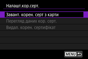 - Щоб видалити кореневий сертифікат, що був імпортований у камеру, на екрані в кроці 5 виберіть [Видал. корен. сертифікат]. Щоб перевірити отримувача та автора сертифіката, термін його дії та іншу інформацію, виберіть пункт [Перегляд даних кор. серт.].