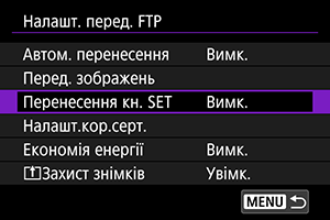 - Якщо не потрібно відключатися від локальної мережі, установіть для параметра [Економія енергії] на екрані [Налашт. перед. FTP] () значення [Вимк.].